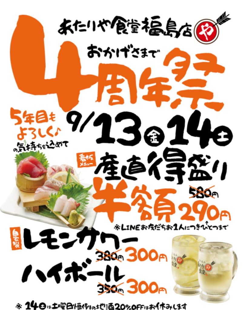 あたりや食堂福島店おかげさまで4周年!