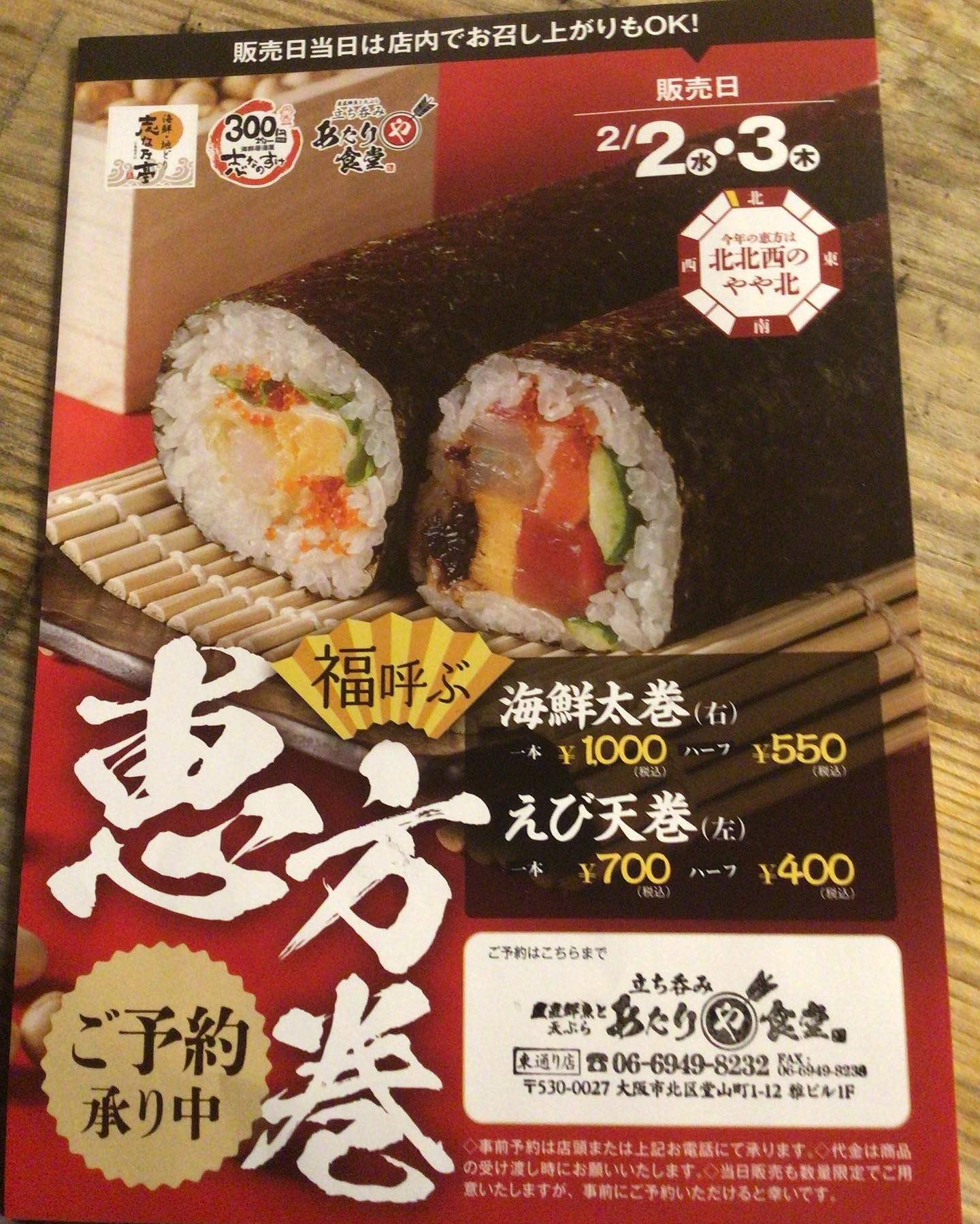 恵方巻き御予約承り中です!海鮮太巻一本1000円ハーフ550円海老天巻一本700円ハーフ400円(税込)販売日は2月2日、3日です#ubereats でも販売しますので是非御予約お待ちしてます。今年の恵方は北北西のやや北らしいです天丼色々テイクアウトも出来ますので是非ご利用下さい。#あたりや食堂東通り店 #梅田グルメ #梅田寿司 #梅田海鮮 #梅田日本酒 #日本酒女子 #1人飲み女子 #ちょい飲み #あいにくの雨 #外に出たく無い日 #そんな日は #ubereats #天丼専門店 #あたりや食堂東通り店 #で調べてみてね