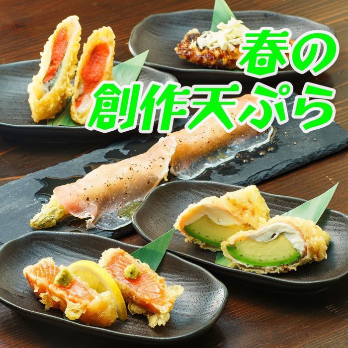春の新メニュー第2弾★ちょっとおしゃれな【創作天ぷら】・うなぎバター🧈天350円上にのってるふわふわバターがお茶目・レアサーモン天400円ほんのりサーモンピンク…