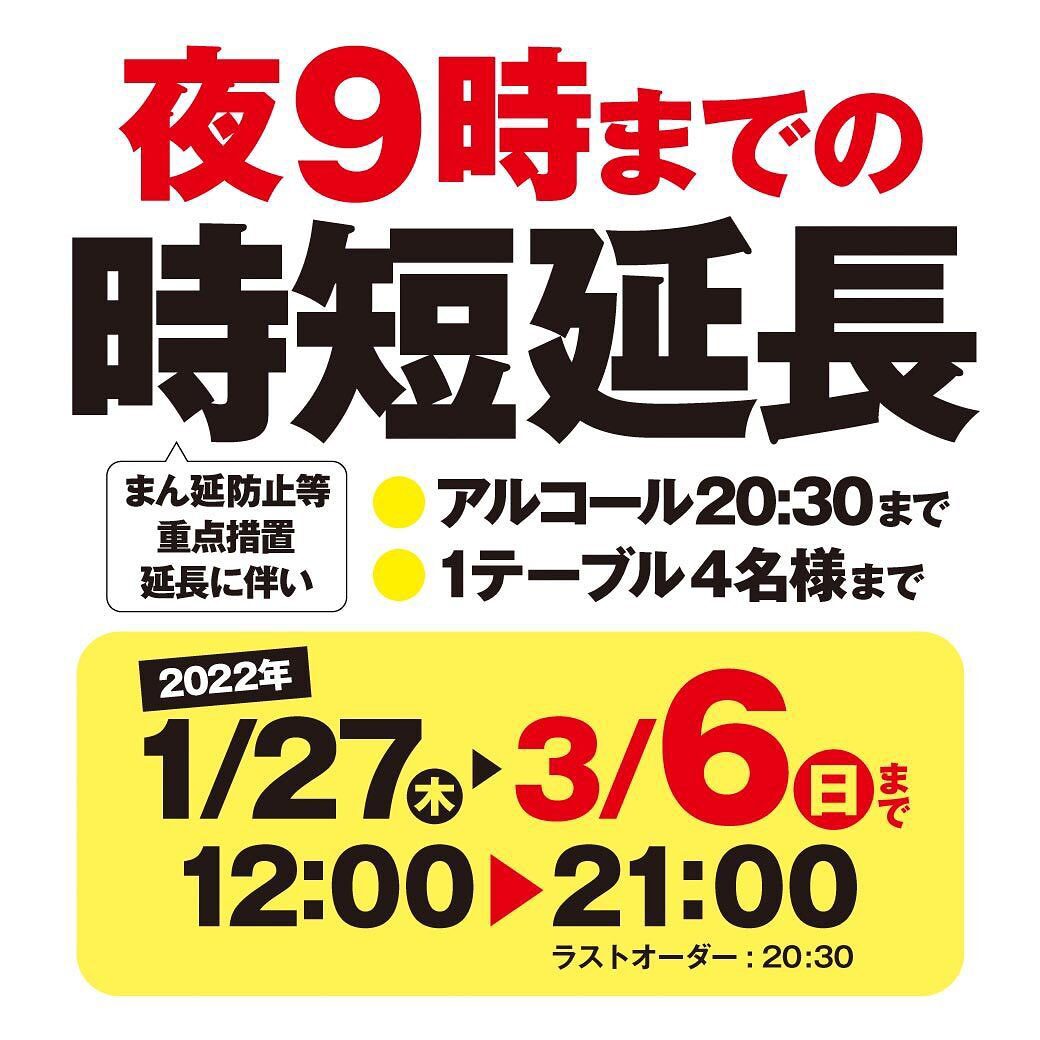 時短営業☆延長~大阪府のまん延防止措置延長にともない#時短営業 を3月6日まで継続することになりました★営業時間12:00~21:00・アルコールの提供20:30まで・1テーブル4人までこれがきっと最後!と信じます!今しばらくご協力お願いします#あたりや食堂東心斎橋店 はお昼12時から営業中#昼飲み 大歓迎♪定食メニューや弁当や丼のテイクアウトもやってますお気軽にご利用くだい#心斎橋居酒屋あたりや食堂 #あたりや食堂 #心斎橋グルメ #心斎橋ランチ #心斎橋パルコ #立ち飲み #アワビ踊り焼き #刺身 #日本酒バー #心斎橋テイクアウト #心斎橋デリバリー